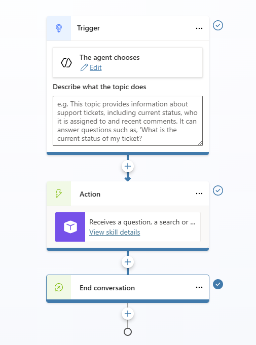 Solution: Instead of including the Retrieval Suite as a Tool, you should include it as a topic which always triggers. As the only step, the topic calls the RheinInsights Tool and afterwards it must end the conversation. See the following workflow: