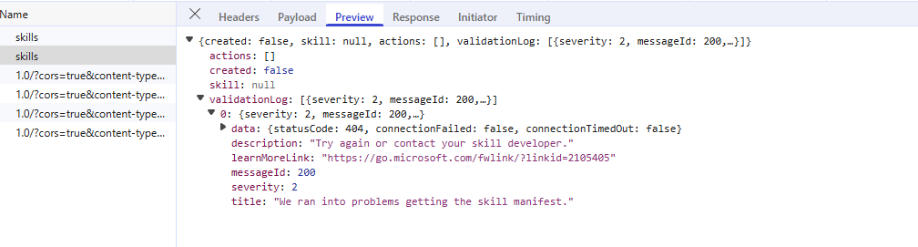 Observation: When trying to fetch the skill manifest, the message “We ran into problems getting the skill manifest.” is shown. The network trace console shows for this call the message statusCode: 404. See the following screenshot: