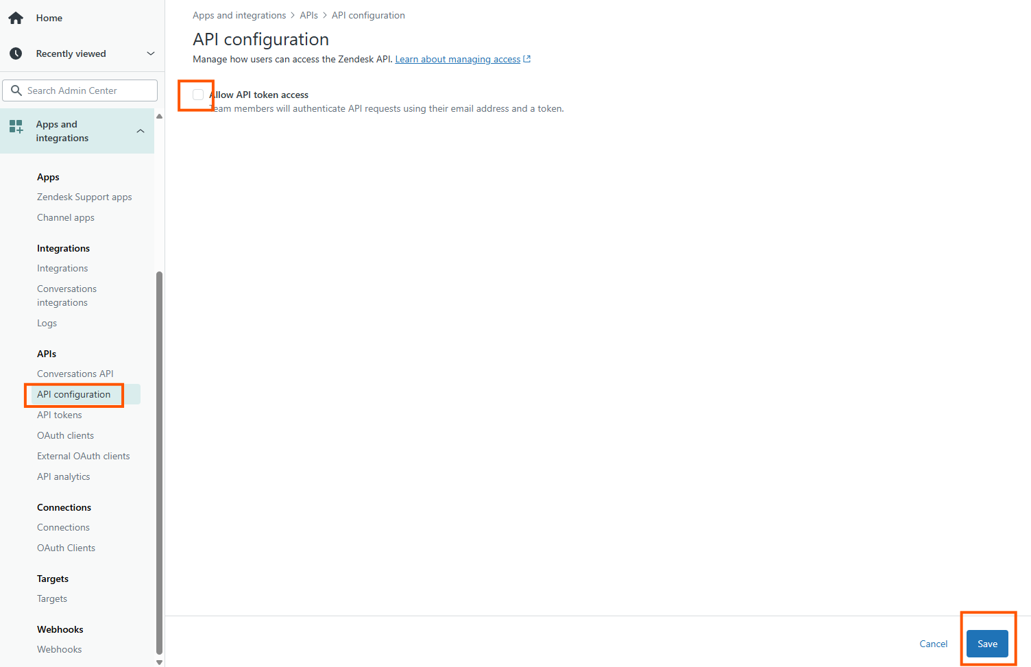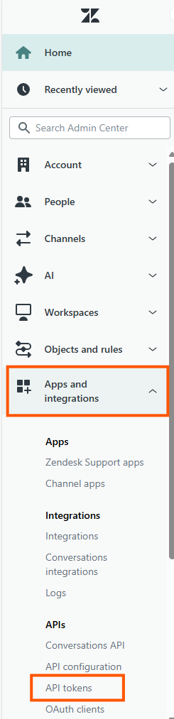 The connector uses an API token to authenticate against the Zendesk APIs. To create a token, please do the following. As an administrator go to the Admin center