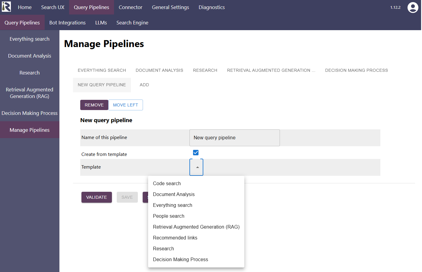 Here, you can add, remove or reorder the query pipelines. Changes are only persisted if you click on validate and save. If you leave the screen without saving, then nothing will be persisted.