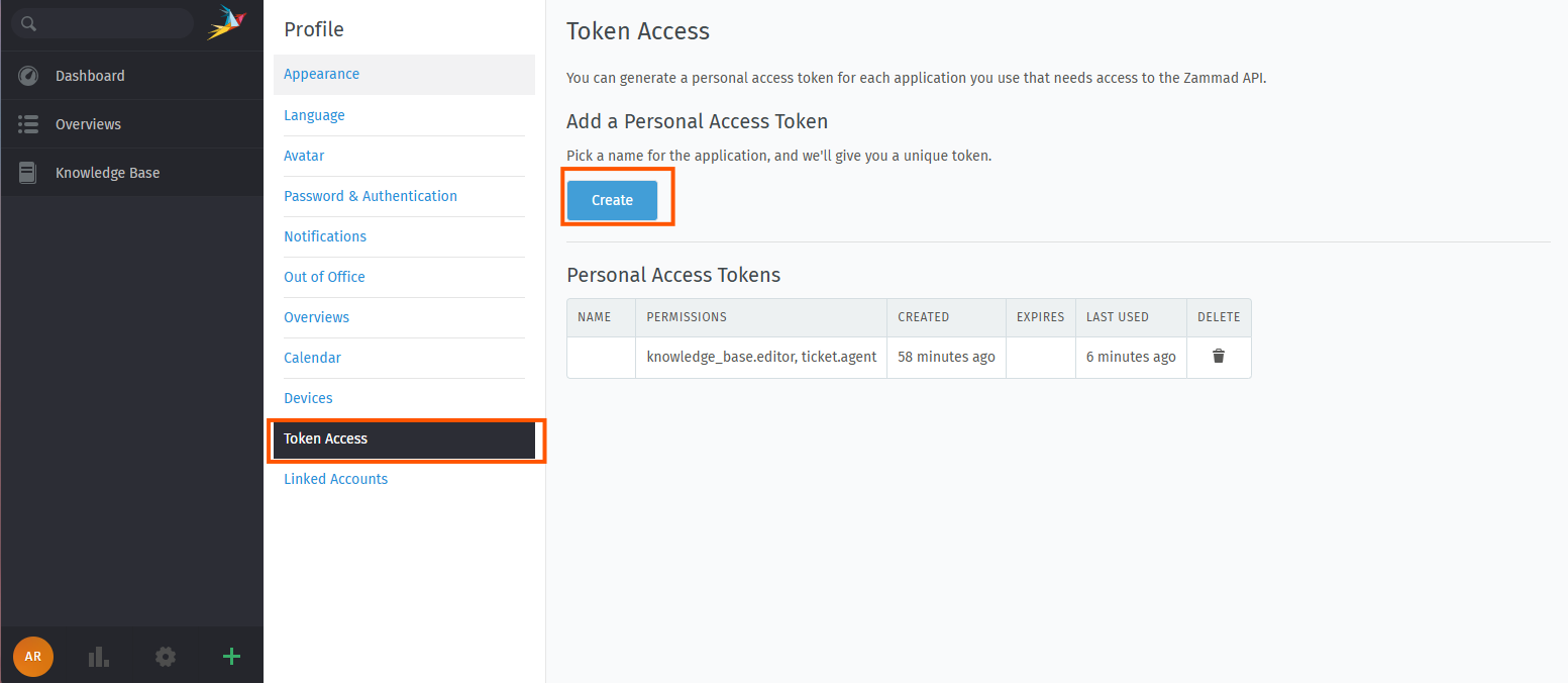The connector uses an Pesonal Access token or basic authentication to authenticate against the Zammad APIs.