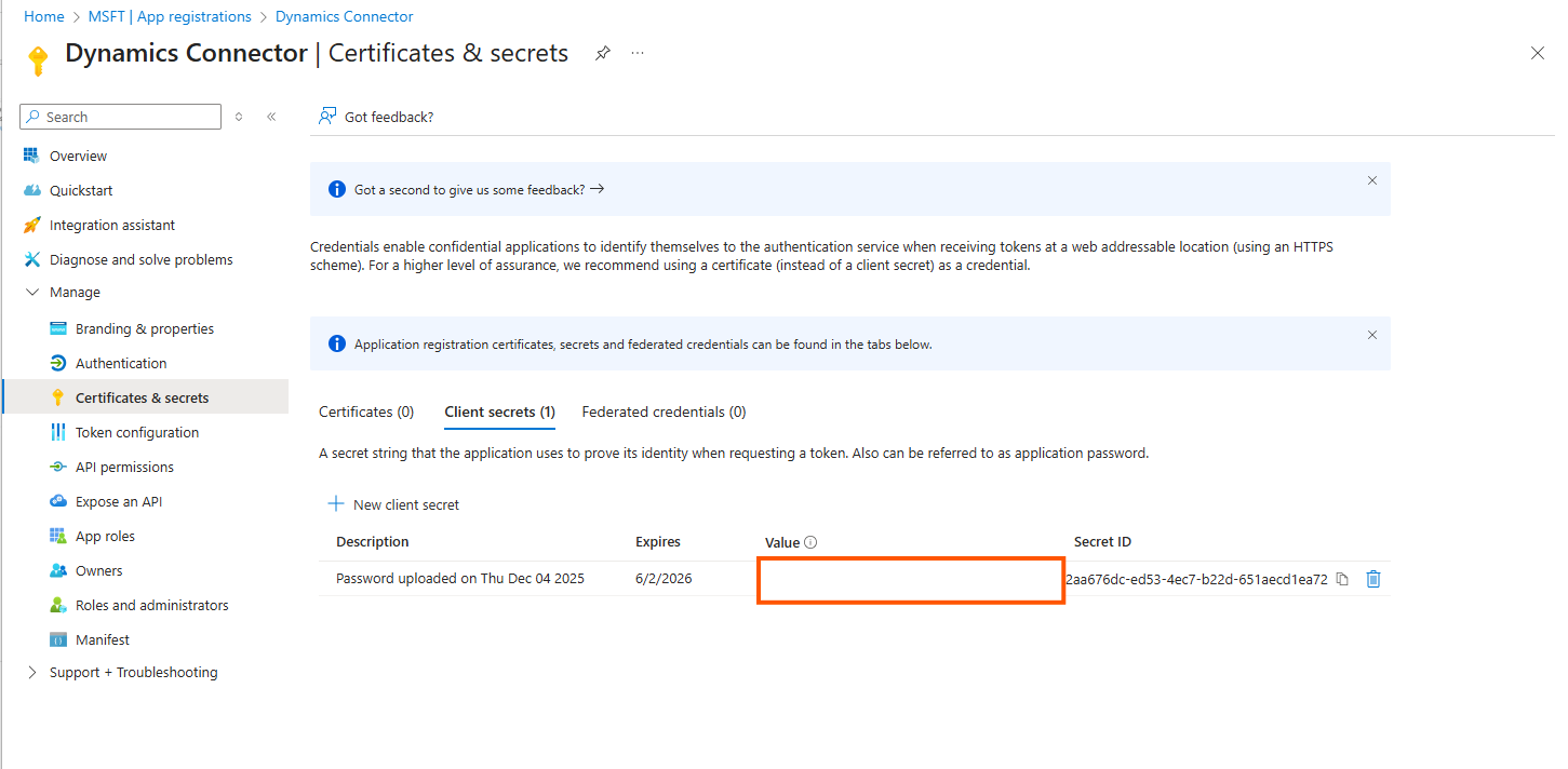 Client secret: This is the secret which was generated in the Entra Id app above.