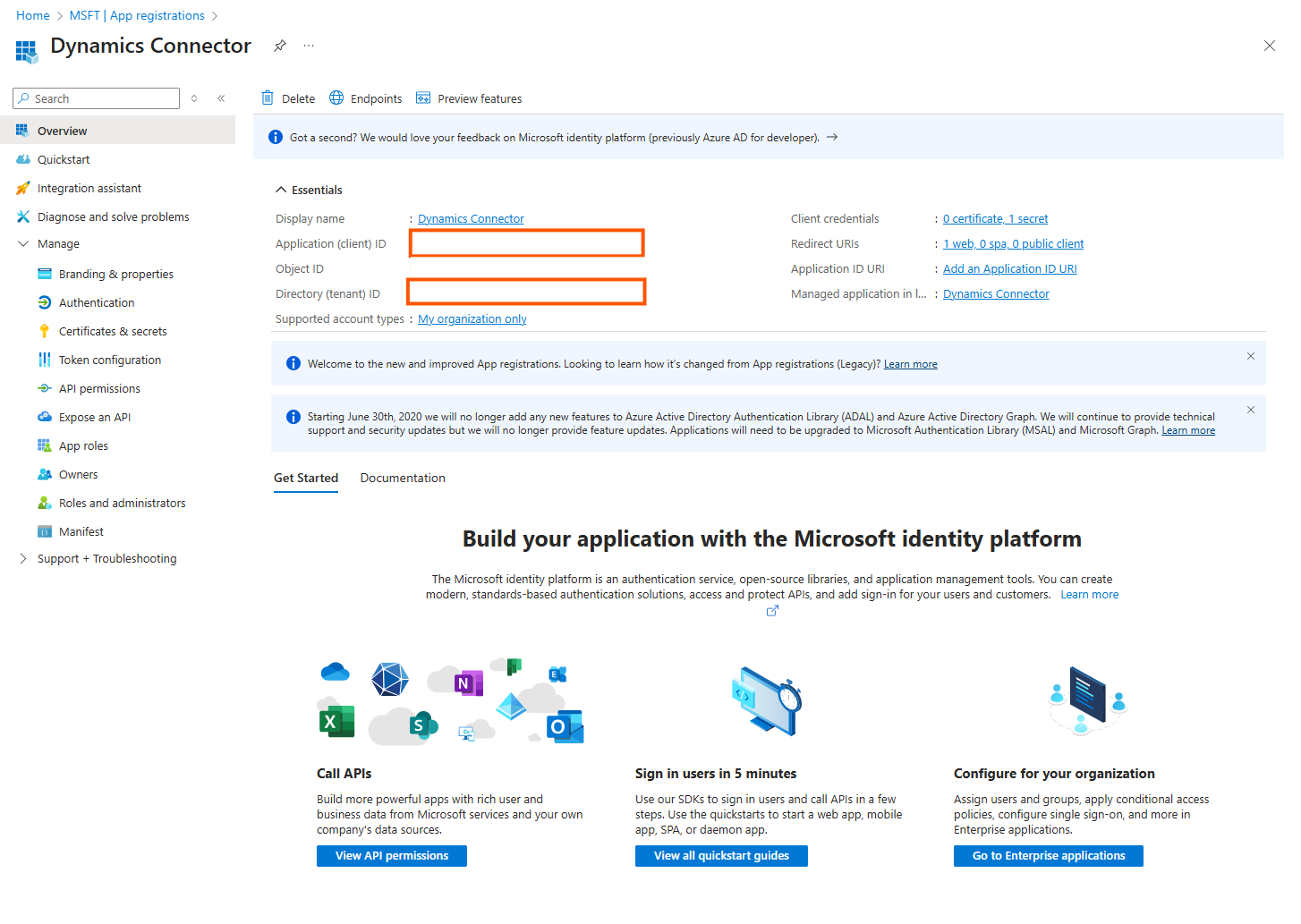 Click on Overview and make a note of the application (client) id and directory (tenant id) which will be used in the configuration below