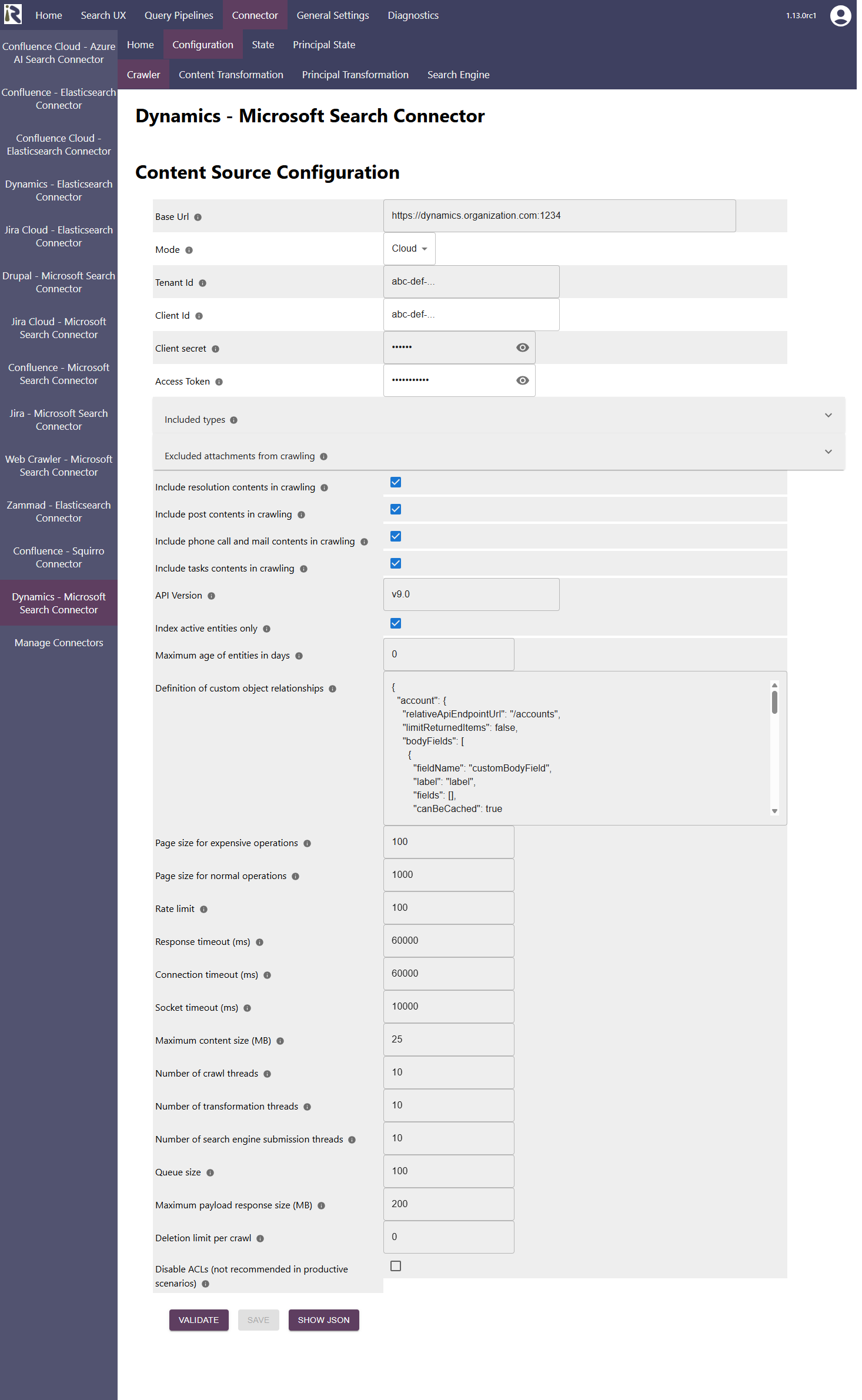{ "accounts": { /* This is the name of an existing entity type */ "limitReturnedItems": false, /* determines if the operation should include a lower number of records */ "extendsExistingType": true, /* This value defines if an existing type (account) should be extended, if set to true it is important that account above matches an existing type. Otherwise the configuration will not be successfully validated. */ "bodyFields": [ /* here you can define entity fields which should be included in the document body. Each field can have a label (if not given, it is not shown), a fieldName (mandatory) and a fieldType (integer, double) to format the value accordingly. These fields will be added at the end of the default body. */ { "label": "Account Name", "fieldName": "name" }, { /* You can also add lookups and lookups in lookups. */ "relativeApiEndpointUrl": "/custom_industrycategory", /* is the API endpoint which should be used. */ "idFieldInForeignEntity": "industrycategoryid", /* the id filter in the $filter statement, for instance /custom_industrycategory?$filter=industrycategoryid eq value */ "idFieldInInnerEntity": "_custom_industrycategoryid_value", /* determines the id value to filter in the above statement */ "fields": [ /* provides a list of fields which then should be extracted from the matching records, same logic as in bodyFields */ { "label": "Industry", "fieldName": "name" } ], "canBeCached": true /* Determines if this lookup will be repeatedly done with the same ids from different top level records. So the connector will build up a cache which will reduce the number of API calls */ } ], "metadataFields": [ { "label": "Address 1 - Country", "fieldName": "address1_country" }, { /* You can also add lookups and lookups in lookups. */ "relativeApiEndpointUrl": "/custom_industrycategory", /* is the API endpoint which should be used. */ "idFieldInForeignEntity": "industrycategoryid", /* the id filter in the $filter statement, for instance /custom_industrycategory?$filter=industrycategoryid eq value */ "idFieldInInnerEntity": "_custom_industrycategoryid_value", /* determines the id value to filter in the above statement */ "fields": [ /* provides a list of fields which then should be extracted from the matching records, same logic as in metadataFields */ { "label": "Industry", "fieldName": "ap_name" } ], "canBeCached": true /* Determines if this lookup will be repeatedly done with the same ids from different top level records. So the connector will build up a cache which will reduce the number of API calls */ } ] }, "customentity": { "limitReturnedItems": false, /* determines if the operation should include a lower number of records */ "extendsExistingType": false, /* This is a new content type, you need to specify more information below. */ "relativeApiEndpointUrl": "/customentity", /* is the API endpoint which should be used. */ "modifiedOnField": "modifiedon", /* Defines the modifiedon date field. Used for filtering */ "idField": "customentity_id", /* Defines the idField of this entity */ "applicationPermissionRole":"prvReadCustomEntityRole",/* Permission role for this entity type for security trimming */ "titleField": "name", /* Defines the title field*/ "hasAttachments": false, /* If this type has annotations, set it to true */ "parentTitle": "Custom Entity", /* Defines the parentTitle metadata field */ "parentType": "customentity", /* Defines the parentType metadata field */ "entityType": "customentity", /* Defines the entity type, which is used in the search result click URL */ "itemType": "Custom Entity in Human Readable Form", /* Defines the itemType metadata and should be human readable */ "bodyFields": [ /* here you can define entity fields which should be included in the document body. Each field can have a label (if not given, it is not shown), a fieldName (mandatory) and a fieldType (integer, double) to format the value accordingly */ { "fieldName": "fieldName1" }, { "label": "Label", "fieldName": "fieldName2" }, { "relativeApiEndpointUrl": "/lookup", "idFieldInForeignEntity": "lookupid", "idFieldInInnerEntity": "_llokupid_value", "fields": [ { "label": "Another Label", "fieldName": "name" } ], "canBeCached": true } ], "metadataFields": [ /* here you can define entity fields which should be included in as metadat. Each field must have a label (the field name in the search schema), a fieldName (mandatory, a fieldName of the entity) and an optional fieldType (integer, double) to format the value accordingly */ { "label": "Metadata Label", "fieldName": "fieldName3", "fieldType": "integer" /* example for a field which must be interpreted as an integer */ }, { "label": "Metadata Label", "fieldName": "fieldName4", "fieldType": "double" /* example for a field which must be interpreted as an double. Doubles are formatted with two decimals */ }, { "relativeApiEndpointUrl": "/lookup", /* is the API endpoint which should be used. */ "idFieldInForeignEntity": "lookupid", "idFieldInInnerEntity": "_lookupid_value", "fields": [ { "label": Metadata Label", "fieldName": "fieldName" } ], "canBeCached": true /* Determines if this lookup will be repeatedly done with the same ids from different top level records. So the connector will build up a cache which will reduce the number of API calls */ } ] } }API Version. Please add the API version here which should be used by the connector. The connector then connects against <baseUrl>/api/data/<api version>/…