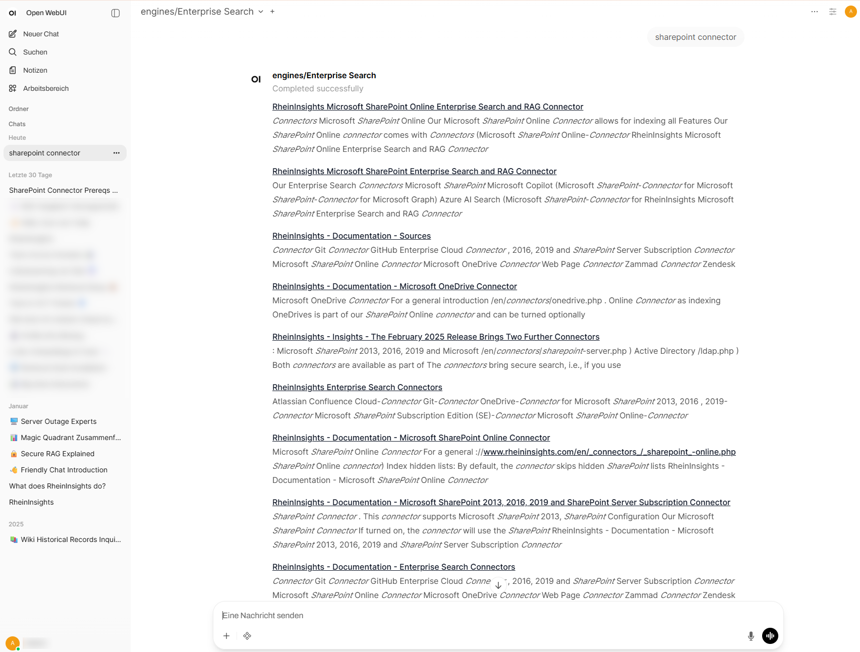 Im Hinblick auf die Verbesserungen für Open WebUI profitieren alle Kunden von neuen, asynchronen KI-Pipelines. Diese ermöglichen längere Berechnungen, ohne dass HTTP-Verbindungen offen gehalten werden müssen. Die Pipeline https://www.rheininsights.com/documentation/182386689.php ermöglicht zudem die Integration klassischer (Stichwort-)Suchergebnisse über unsere Enterprise Search Pipelines in Open WebUI.