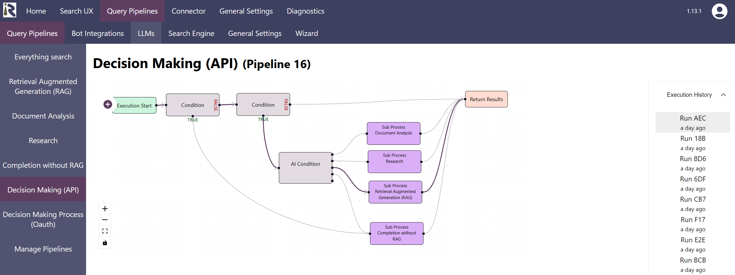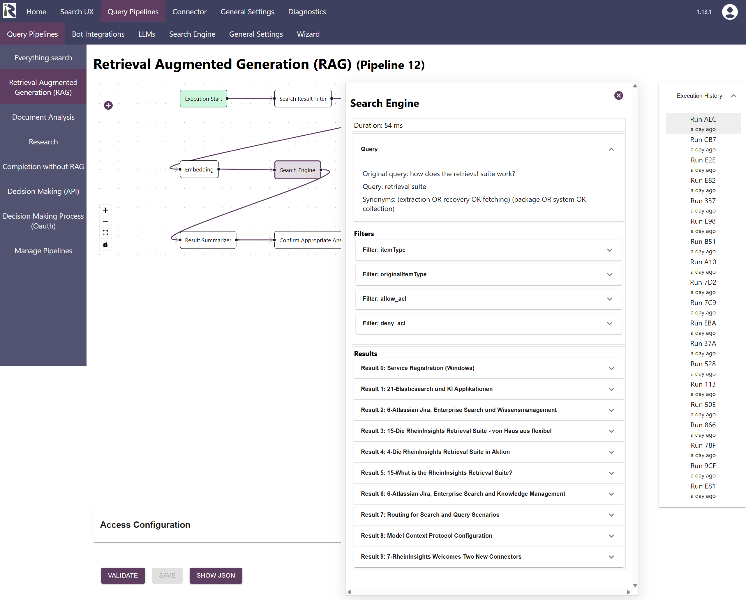 Daher bietet unsere Retrieval Suite ab sofort detaillierte Ausführungsverläufe für ihre Abfragepipelines und die konfigurierten Workflows. Wenn Sie das Logging aktivieren, sehen Sie, welche Pipelines ausgeführt wurden, welche Entscheidungen getroffen wurden und wie die einzelnen Transformationsschritte die Eingaben auf dem Weg zu einem Ergebnis verändert haben.