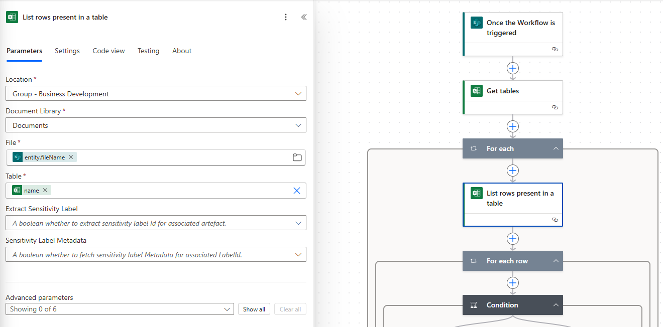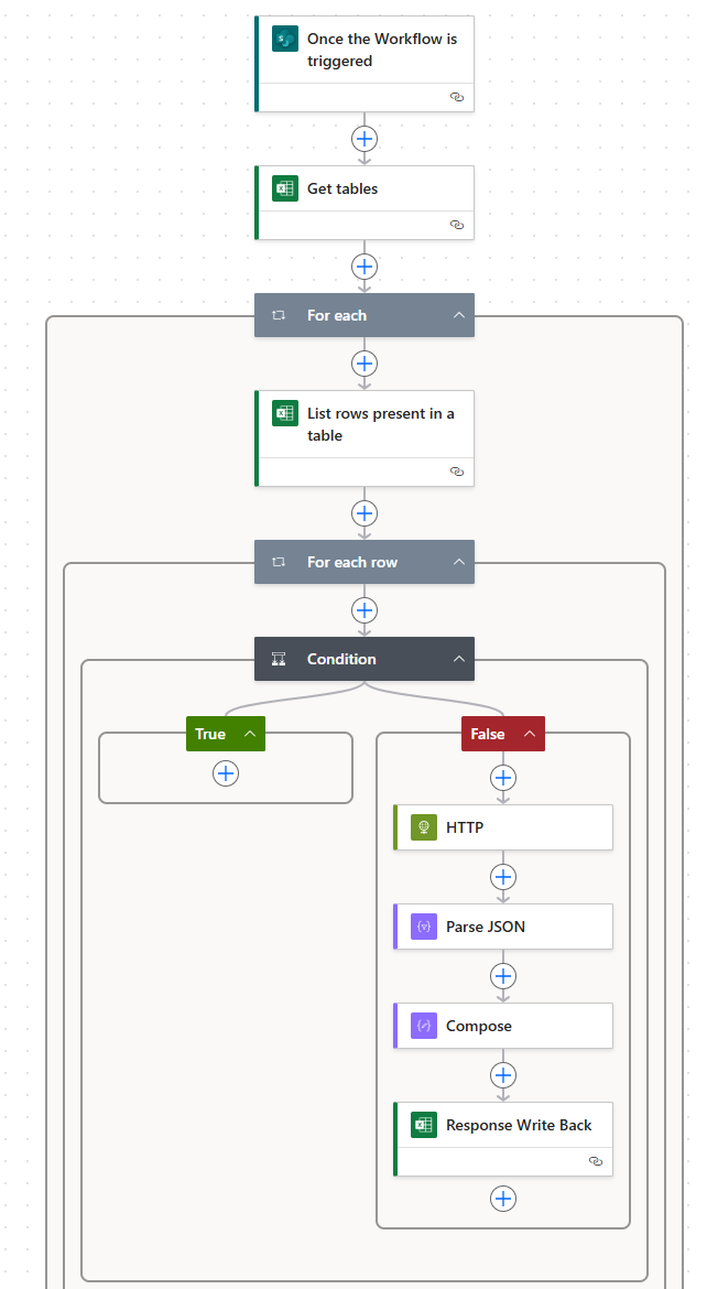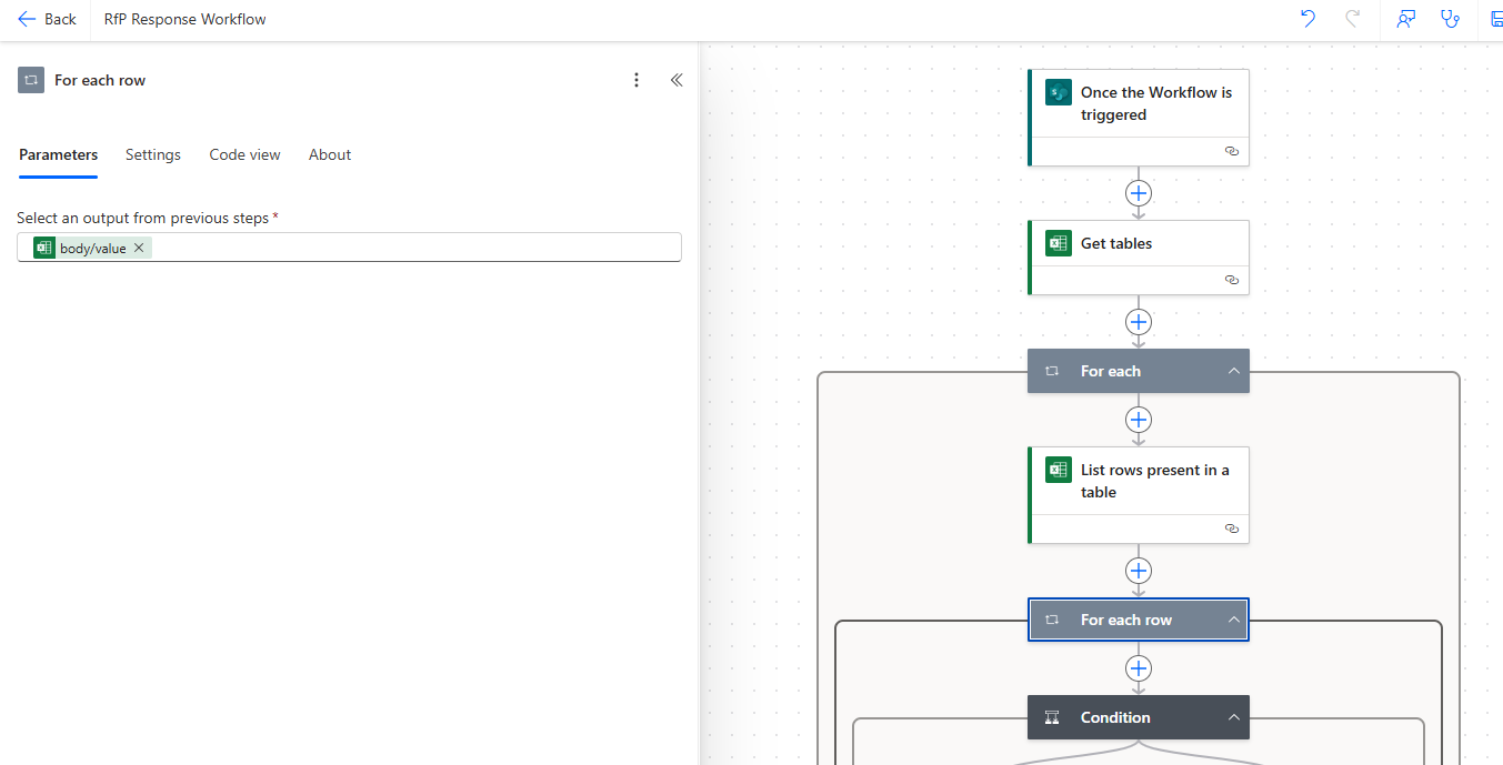 Der Workflow ist an eine bestimmte Dokumentbibliothek in SharePoint Online gebunden. Wird er manuell für eine Excel-Datei ausgelöst, durchsucht er die enthaltenen Tabellen nach der Spalte „Frage“. Die Tabelle muss außerdem die Spalte „Antwort“ enthalten, in die die Antwort zurückgeschrieben wird. Anschließend wird jeder fragliche Wert zeilenweise zur Beantwortung an die RheinInsights Retrieval Suite gesendet. Die JSON-Antwort wird analysiert und in Excel zurückgeschrieben.