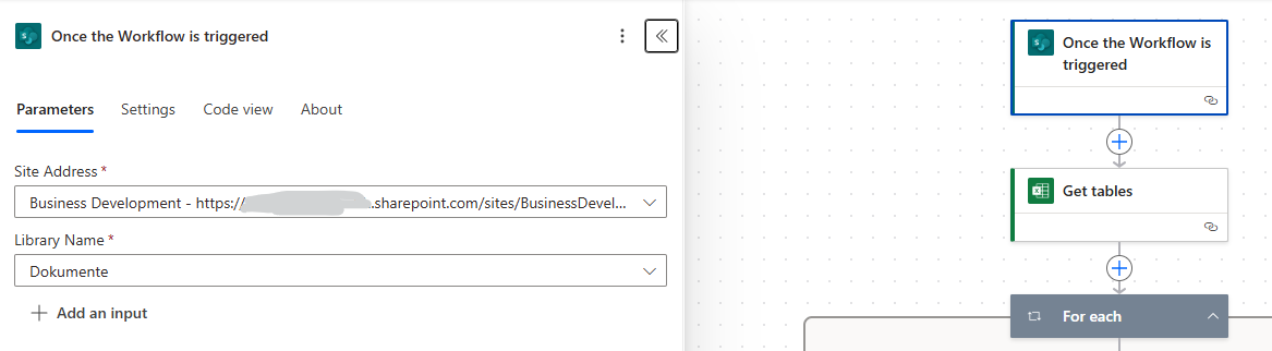 Dies löst den Workflow aus, d. h. es handelt sich um eine manuelle Aktion, die mit einer bestimmten Dokumentbibliothek in SharePoint Online verknüpft ist. Innerhalb der Bibliothek kann der Flow dann manuell ausgelöst werden.