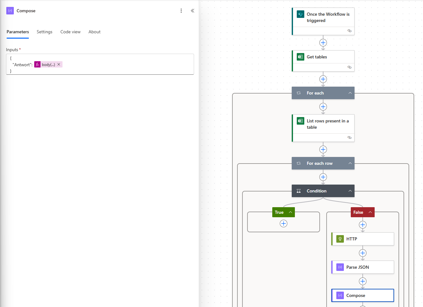 Leider muss vor dem Zurückschreiben von Werten nach Excel ein JSON erstellt werden, welches aus Schlüssel und Werten besteht. Dabei gibt der Schlüssel „Antwort“ beim Zurückschreiben an, in welche Spalte der Zeile der Wert geschrieben werden soll.
