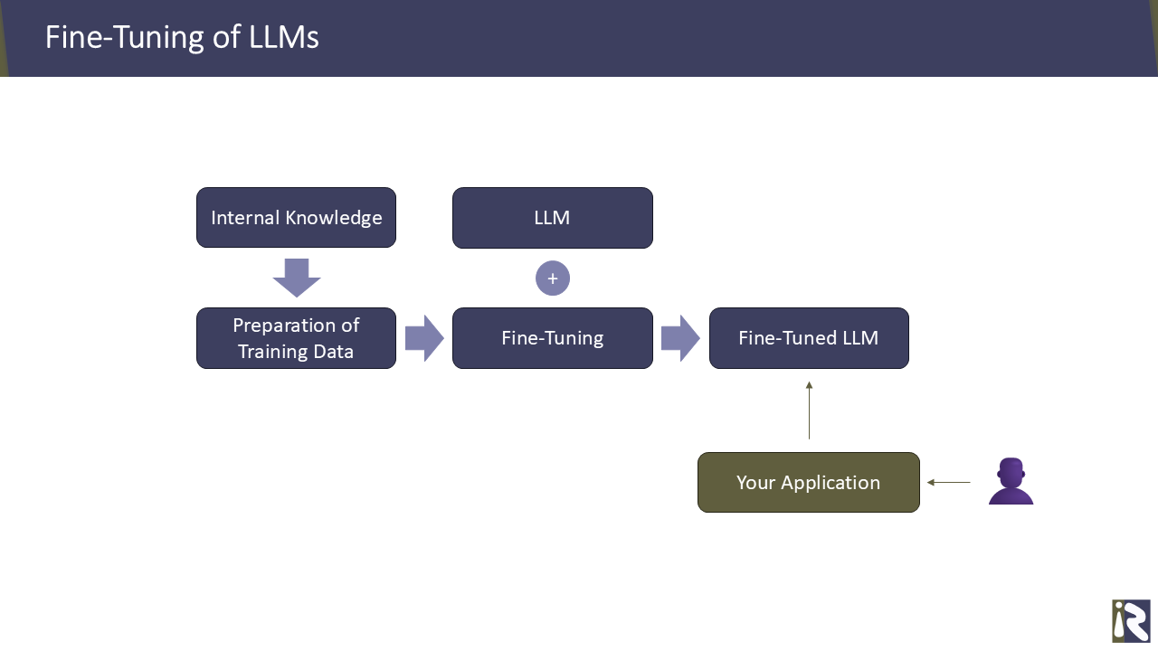Therefore, you can decide to fine-tune a model with your particular training data. It is obvious that you do not train an LLM from scratch. But you take one of the existing commercial or free models as a starting point and actually fine-tune it. This has the advantage that you do not need the entire internet as training data but you can start with relatively small sets of training data. Starting around a few hundred or thousand records. The outcome is a “custom” LLM which handles your use cases.