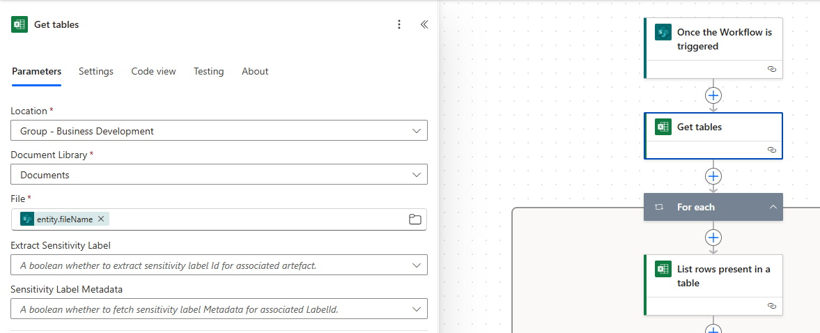 This triggers the workflow, i.e., it is a manual action associated to a given document library in SharePoint Online. Then within the library the flow can be manually triggered.