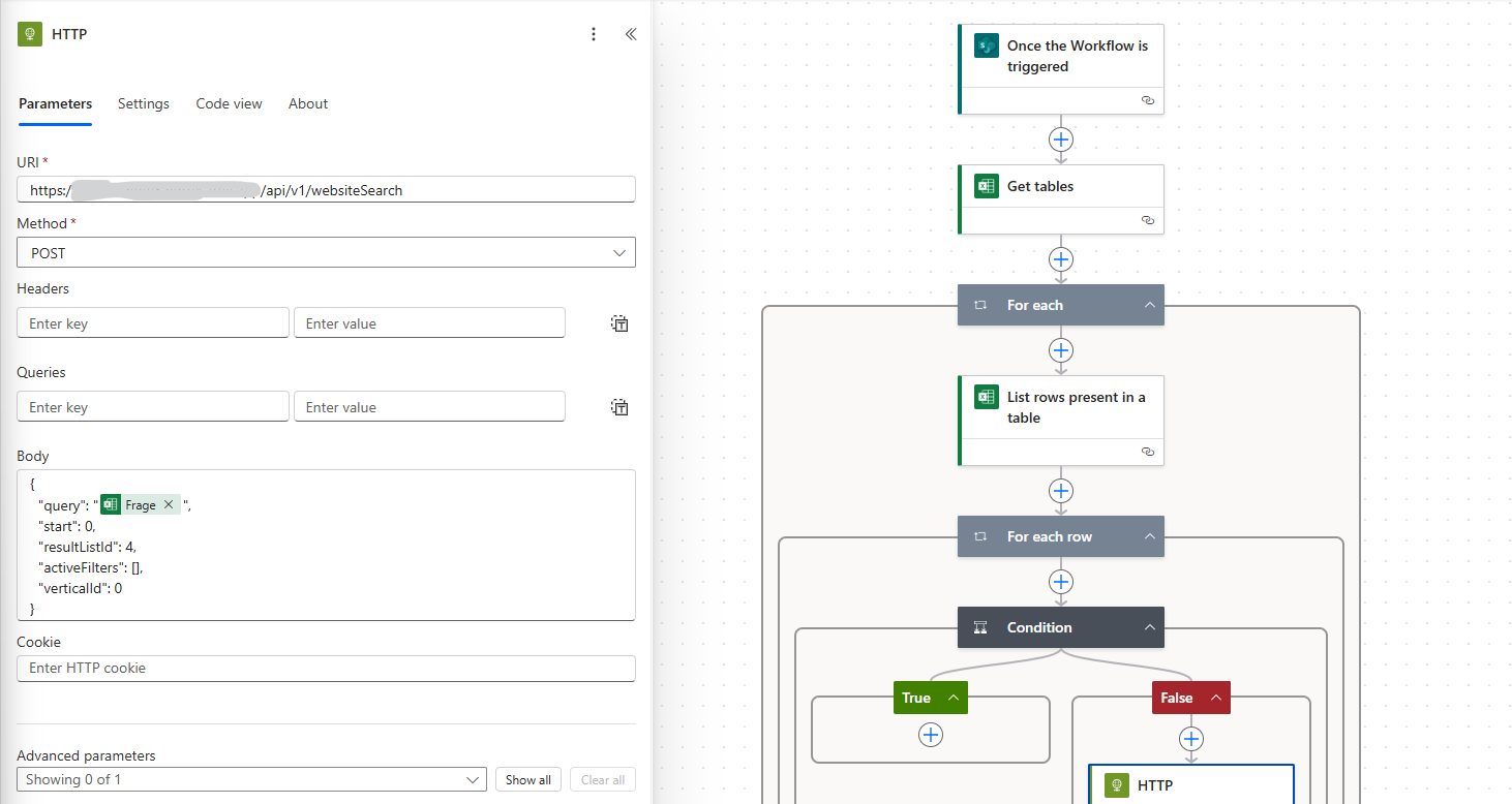 { "query": "@{items('For_each_row')['Frage']}", "start": 0, "resultListId": 4, "activeFilters": [], "verticalId": 0 }