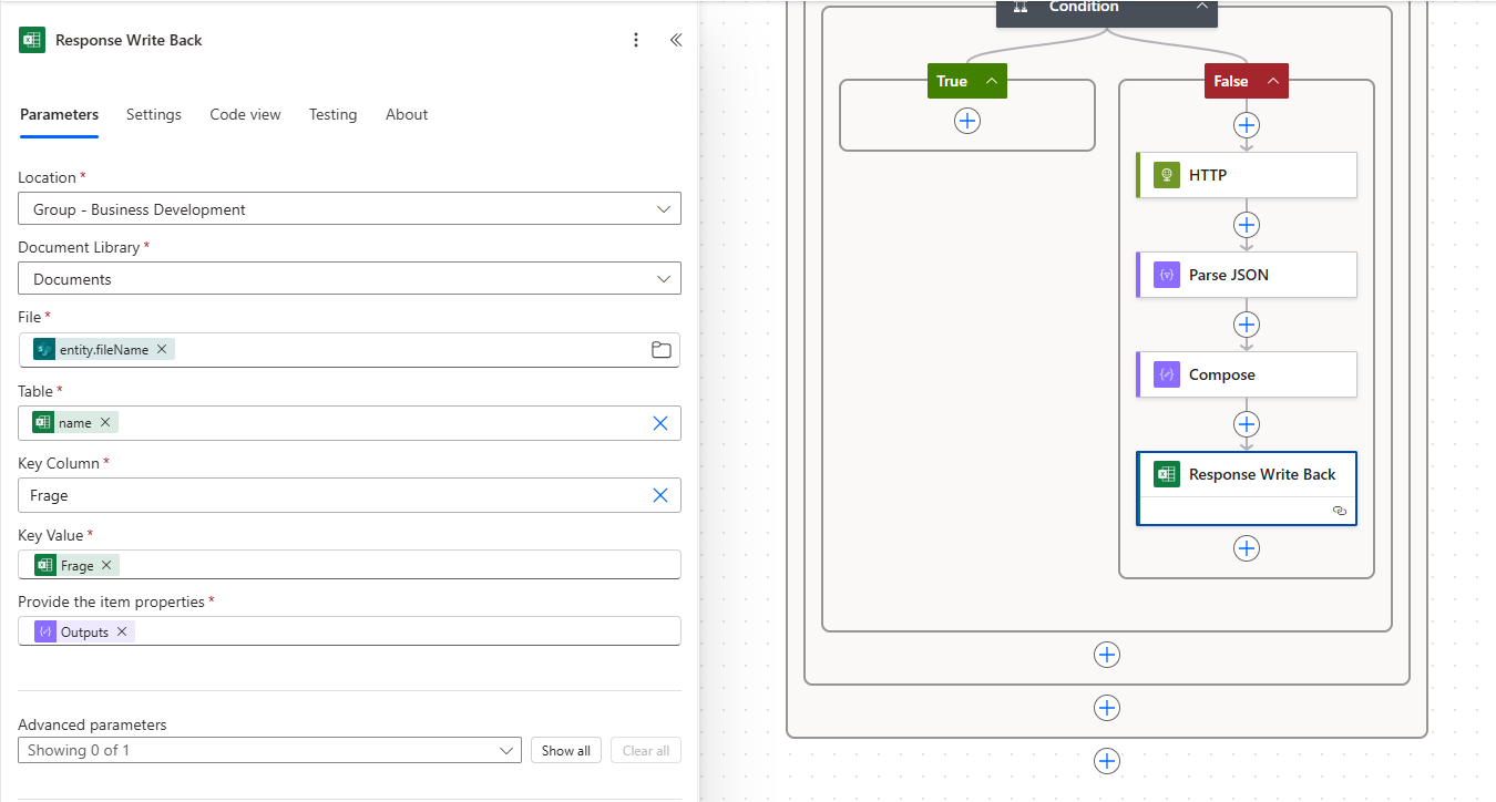Unfortunately, before writing values back to Excel, you need to create a JSON which comprises key and values. Where the key “Antwort” tells the write back in which column of the row the value needs to written.