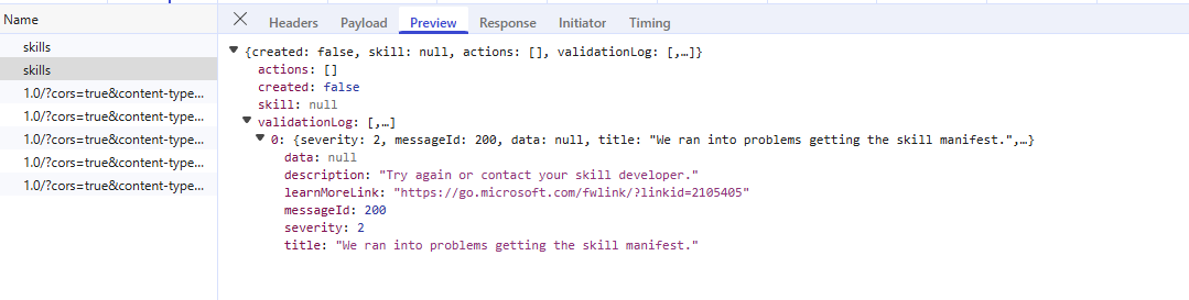 Observation: When trying to fetch the skill manifest, the message “We ran into problems getting the skill manifest.” is shown. The network trace console shows for this call the message statusCode: 404. See the following screenshot:
