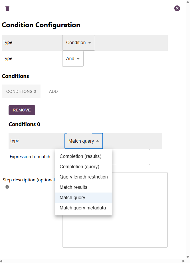 Here you can add one or more conditionsCompletion (query): this applies AI on the query. If prompt and query generate conditionMatched: true in the LLM response, the condition evaluates to true.