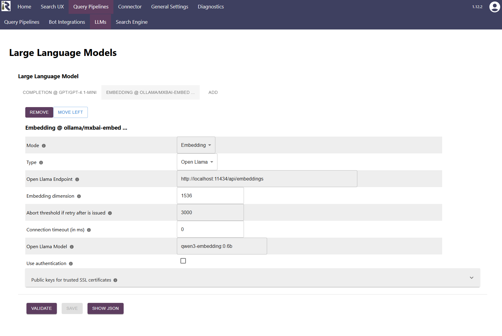 Large language models, in particular completions and embeddings, are used at various places in the RheinInsights Retrieval Suite. For the query pipelines, you can find the configuration at