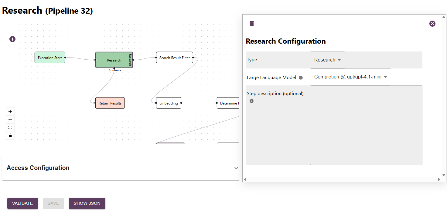This step breaks up a given query into logical sub parts. It then executes the given research process to answer the research questions in parallel. Afterwards, it reformulates the query so that it matches the original intent but takes into account the insights from the research.