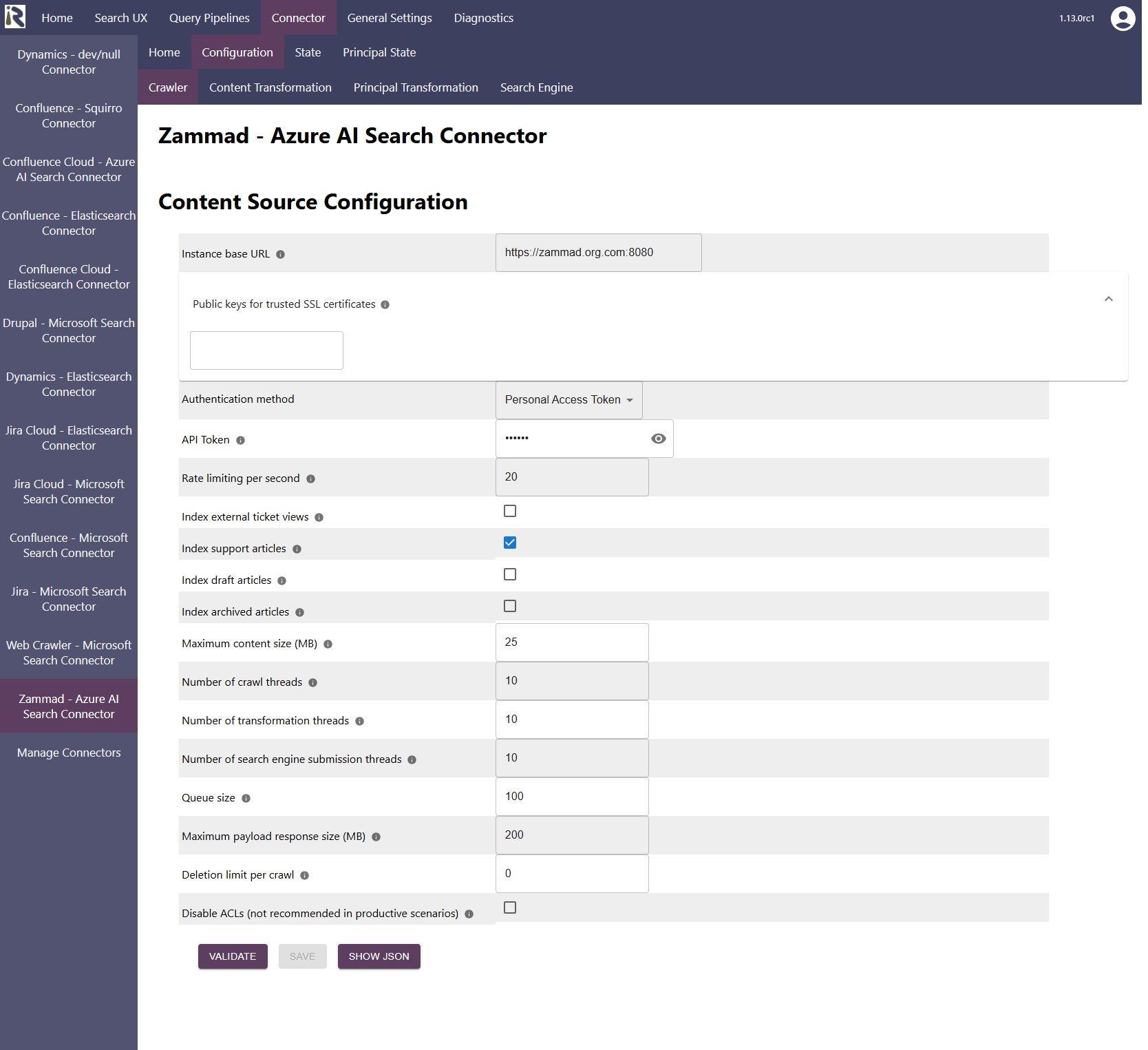 After entering the configuration parameters, click on validate. This validates the content crawl configuration directly against the content source. If there are issues when connecting, the validator will indicate these on the page. Otherwise, you can save the configuration and continue with Content Transformation configuration.